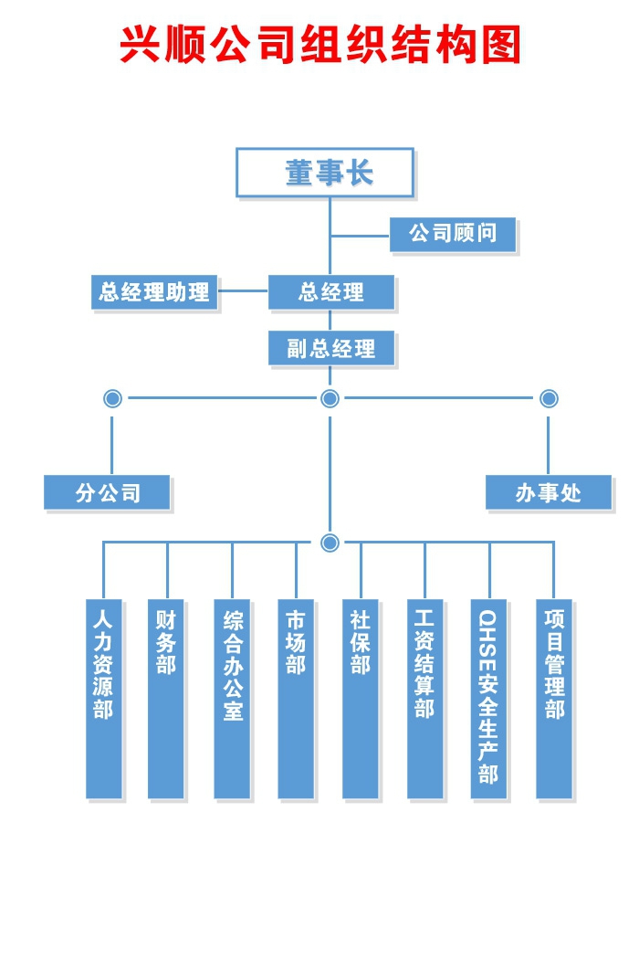 公司下設(shè)有:四川興順勞務(wù)代理有限公司成都分公司、四川興順勞務(wù)代理有限公司物業(yè)服務(wù)分公司、敘永辦事處、貴陽辦事處、云南辦事處、廣西辦事處、德陽辦事處、百色辦事處、赤水辦事處、川中公管中心南充辦事處;四川金帆建筑勞務(wù)有限公司各工程項目部。公司內(nèi)設(shè)有:公司辦公室、財務(wù)部、人力資源部、市場部、外包業(yè)務(wù)管理部、QHSE安全生產(chǎn)部、工資及社會保險管理部、顧問辦公室等職能部門。